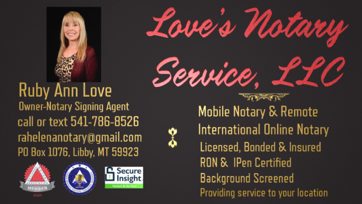 Love's Notary Service LLC provides professional, reliable & efficient notary services in Lincoln, Flathead & Sanders County MT handling various document notarizations, ensuring accuracy & legal compliance. Contact today for all your notary needs in Libby, Kalispell & surrounding areas. I prioritize client satisfaction & offer flexible scheduling options.
